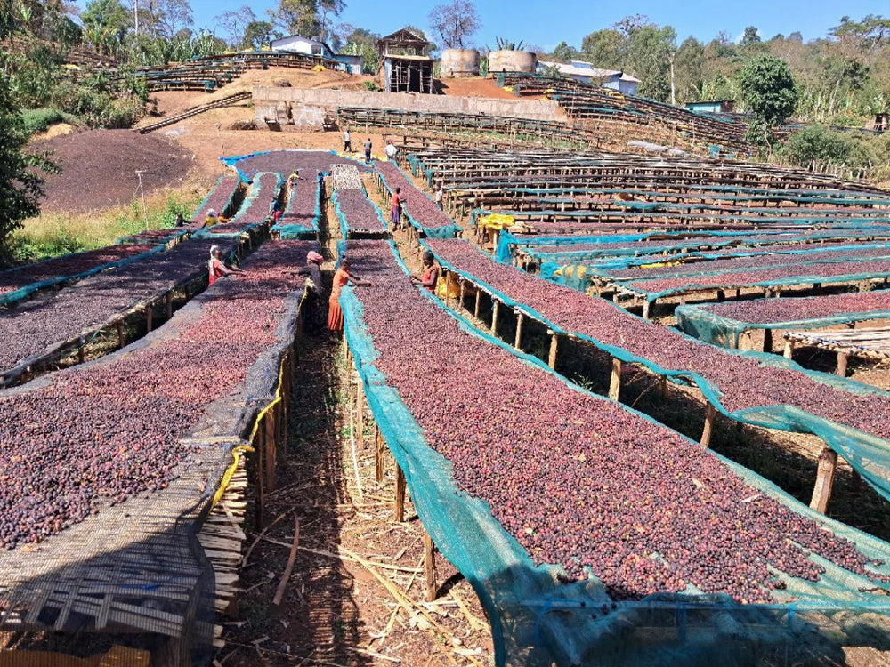 In traditional Ethiopian specialty natural processing, cherries are spread in a thin layer over a raised bed and dried in indirect or direct sunlight. For this supernatural, cherries - hand harvested and selected via Brix measurement at their optimum ripeness - are weighed and spread evenly in a thick layer on raised drying racks lined with plastic sheet. The sheet is then rolled up (not unlike a burrito) and the cherries are fermented for a pre-determined amount of time. Unlike a strict anaerobic fermentation there is some limited oxygenation. After the fermentation period the coffee is shade dried in a thick layer. The precise recipe is a closely guarded secret and varies for each washing station with adjustments to fermentation time, cherry volume, and thickness of drying layers making up the possible variables.