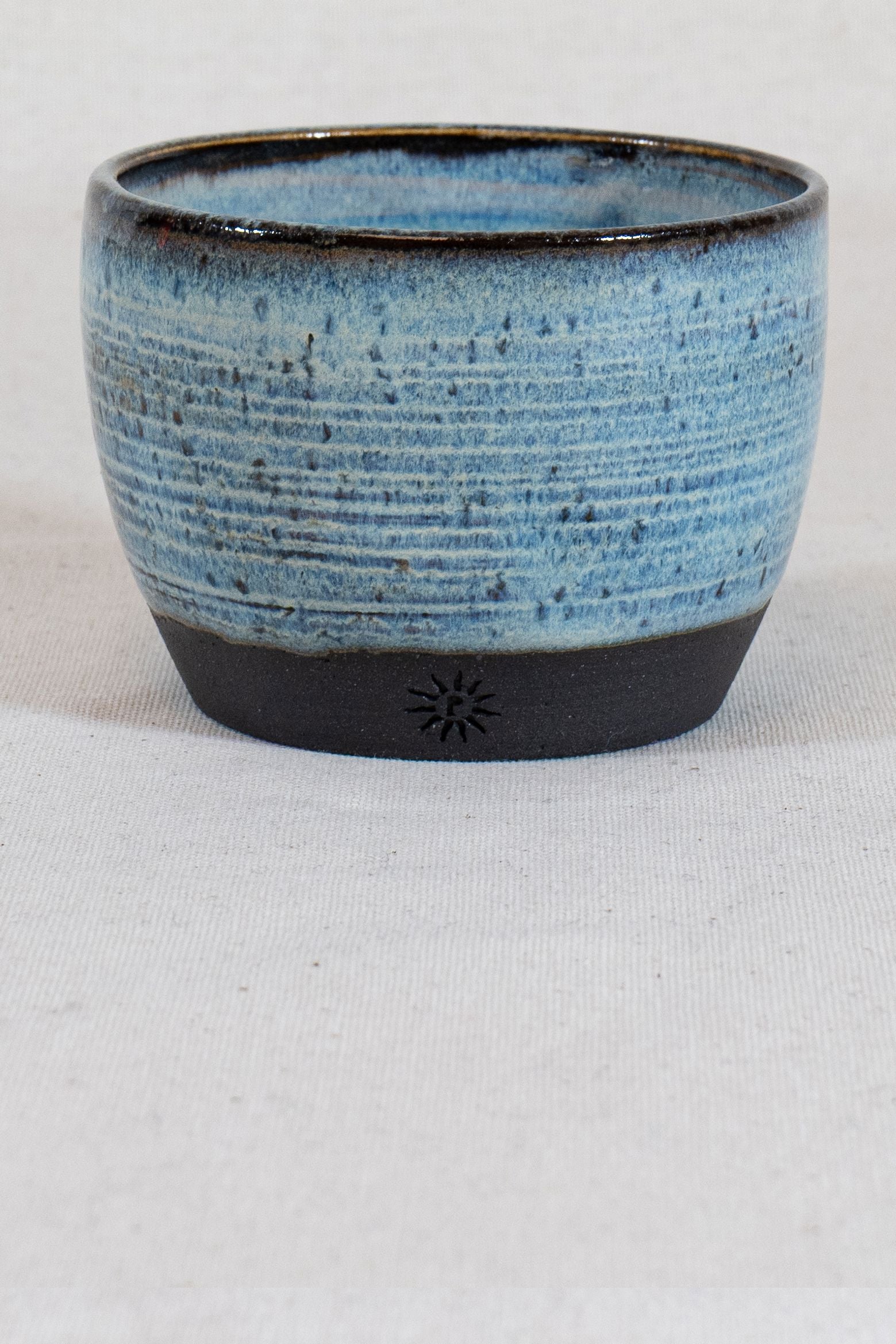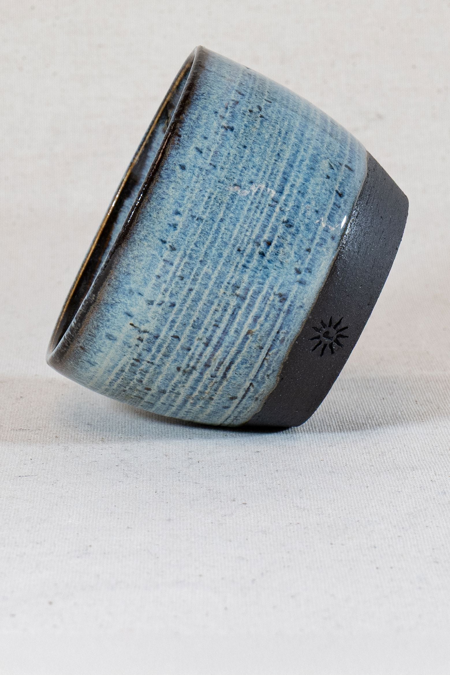 These black clay flat white sized tumblers can vary in size a little due to the variety of clay mixes. But All are between 170ml and 180ml. Perfectly sized for a flat white. Waters edge glaze has been used to decorate.