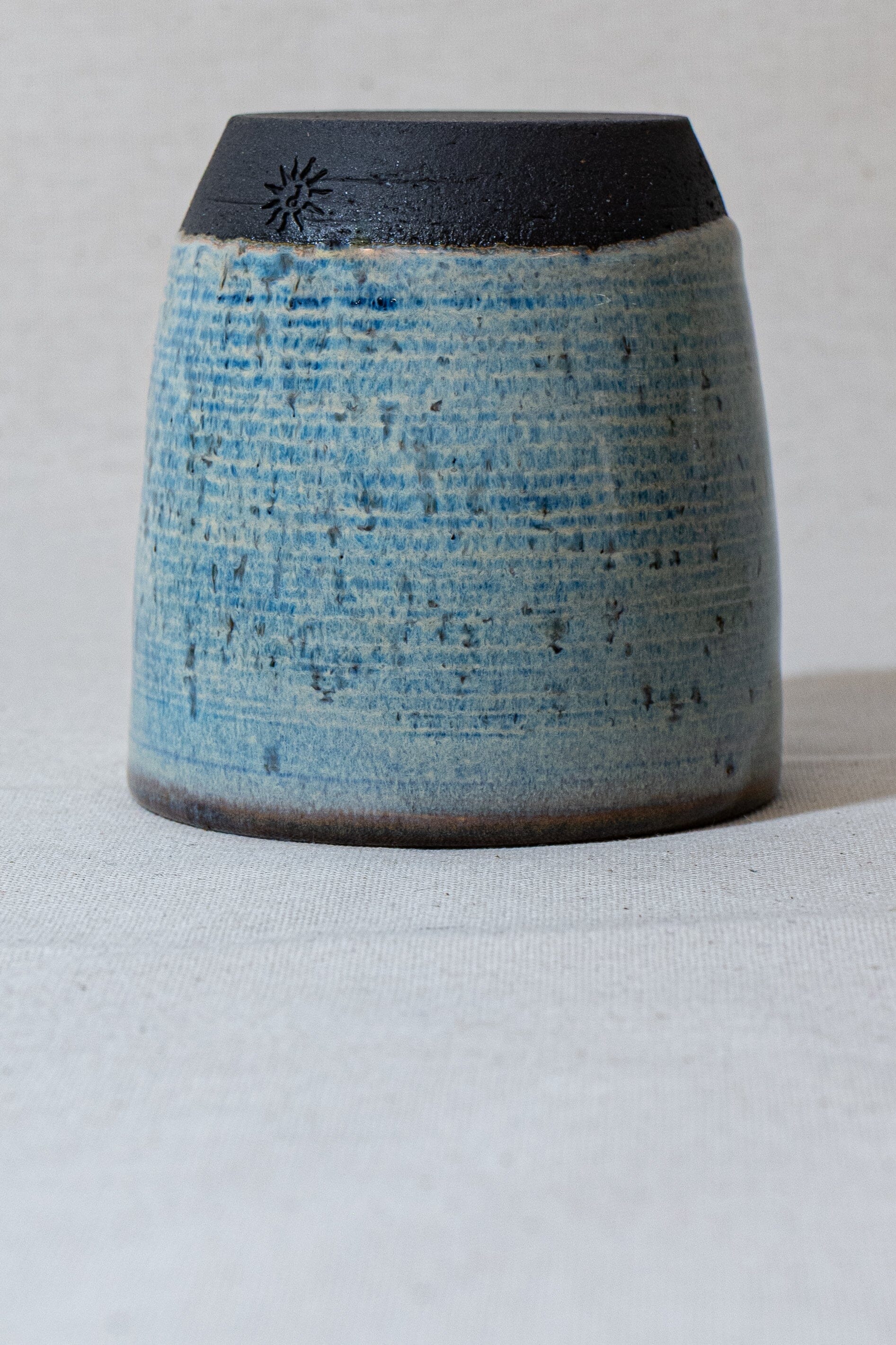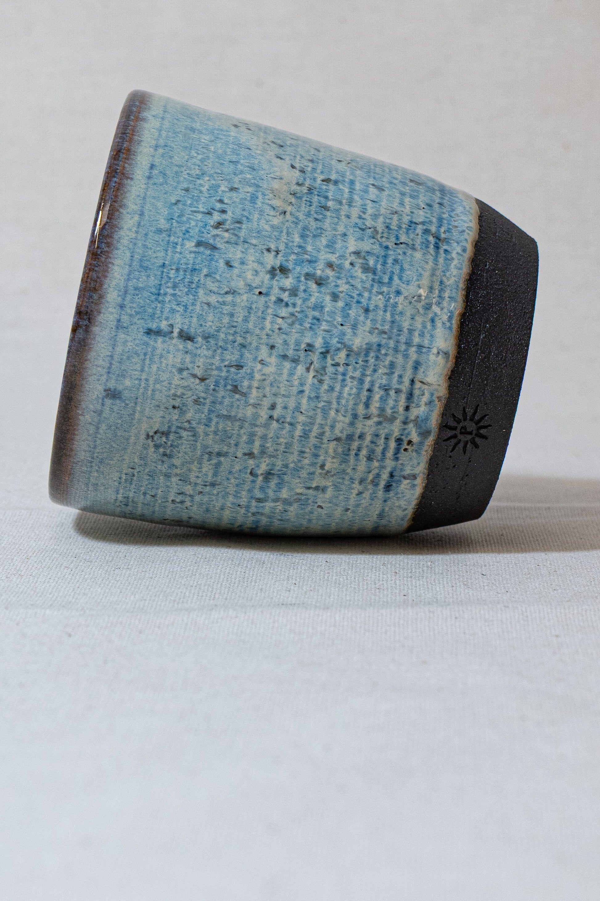 Black stoneware clay, with a waters edge glaze. Hand thrown stoneware tumbler. Black clay with carved parallel lines. Full range of very subtle colour throughout the glaze. The glaze has a different appearance depending on where the tumbler is placed in the kiln, pictures attached show potential differences in pieces. All items are unique in their appearance.